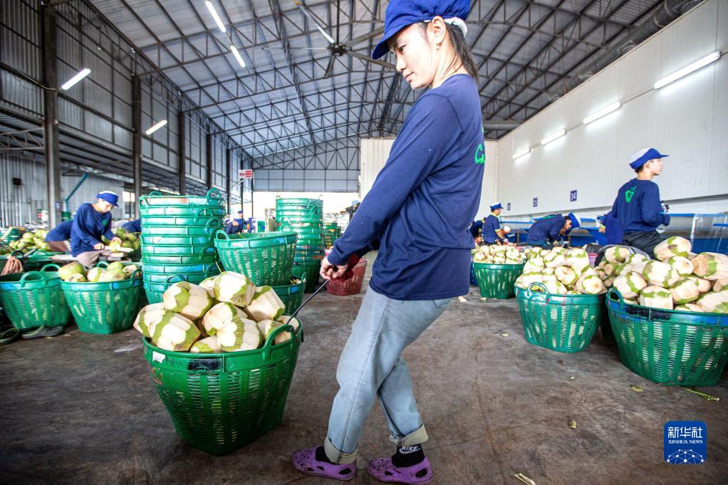 11月3日,工人在泰國叻武里府丹嫩沙多的椰子工廠(chǎng)搬運椰子。