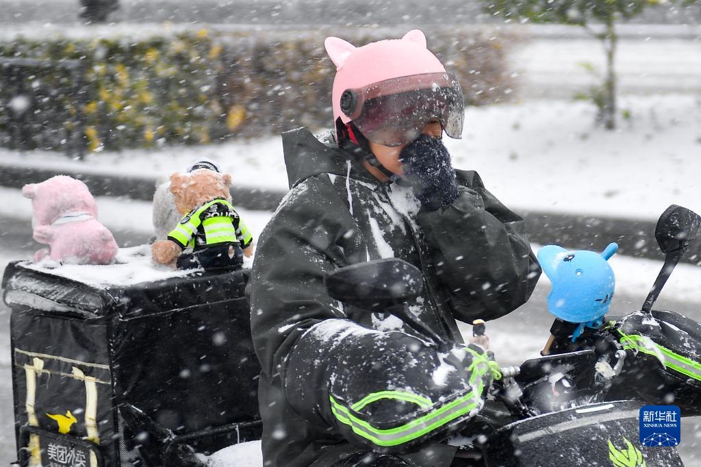 11月6日,在長(cháng)春市街頭,一名外賣(mài)員在雪中騎行。