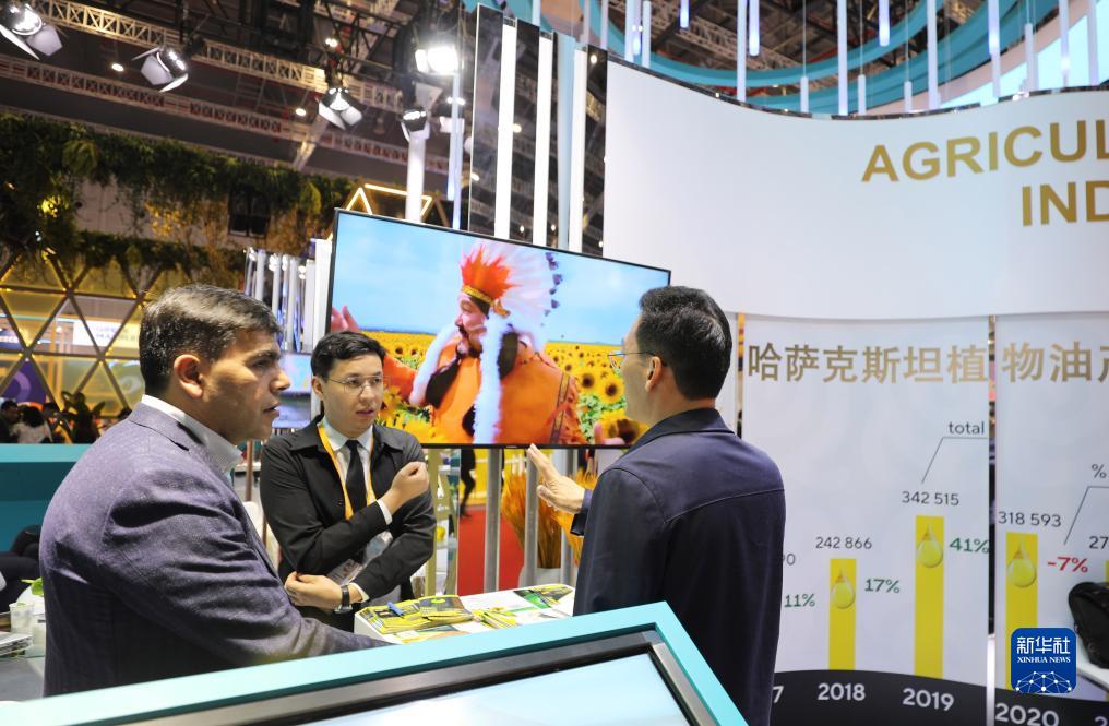 11月6日,參觀(guān)者在第六屆進(jìn)博會(huì )國家展哈薩克斯坦展臺洽談。