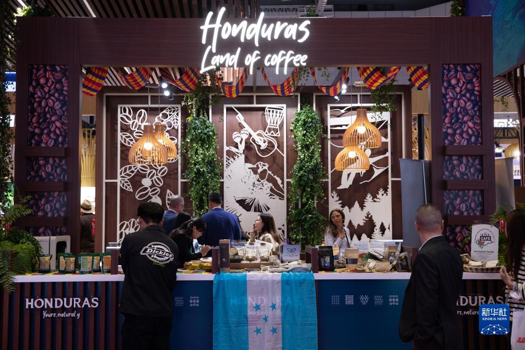11月6日,參觀(guān)者在第六屆進(jìn)博會(huì )國家展洪都拉斯展臺咨詢(xún)咖啡豆等展品信息。