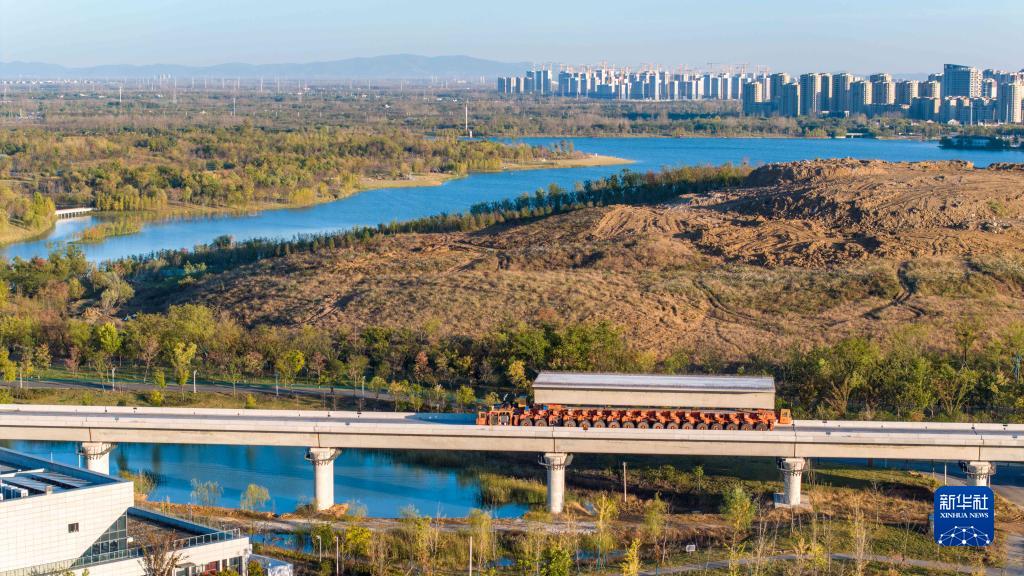 施工車(chē)輛在中鐵四局合新鐵路安徽段運送箱梁(11月6日攝,無(wú)人機照片)。