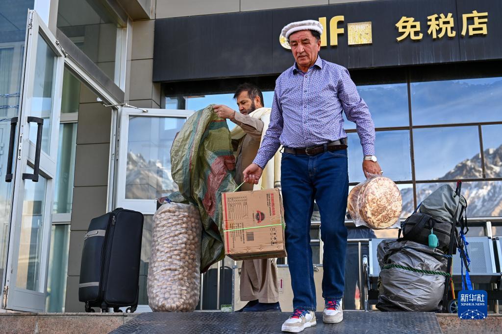 在新疆紅其拉甫口岸,出境旅客攜帶新疆核桃、馕等特色食品準備登車(chē)(11月6日攝)。