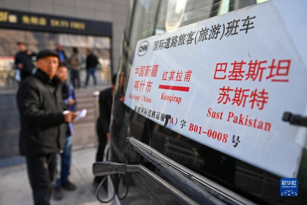 在新疆紅其拉甫口岸,出境旅客排隊登上國際道路旅客班車(chē)(11月6日攝)。