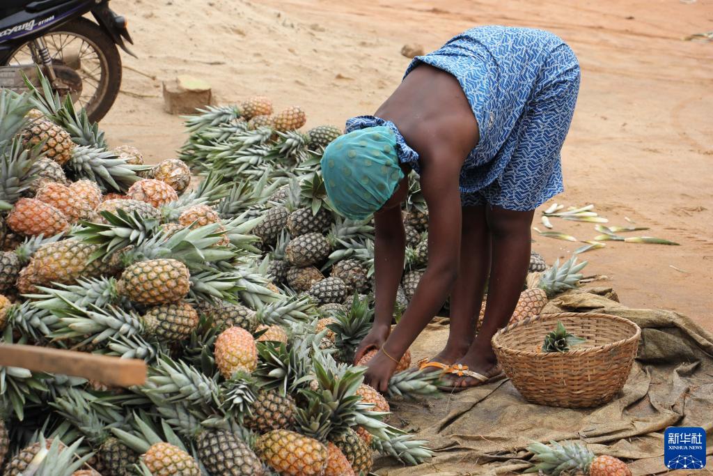 10月23日,一名女孩在貝寧“甜面包”菠蘿主產(chǎn)區阿拉達的一處收購點(diǎn)擺放菠蘿。