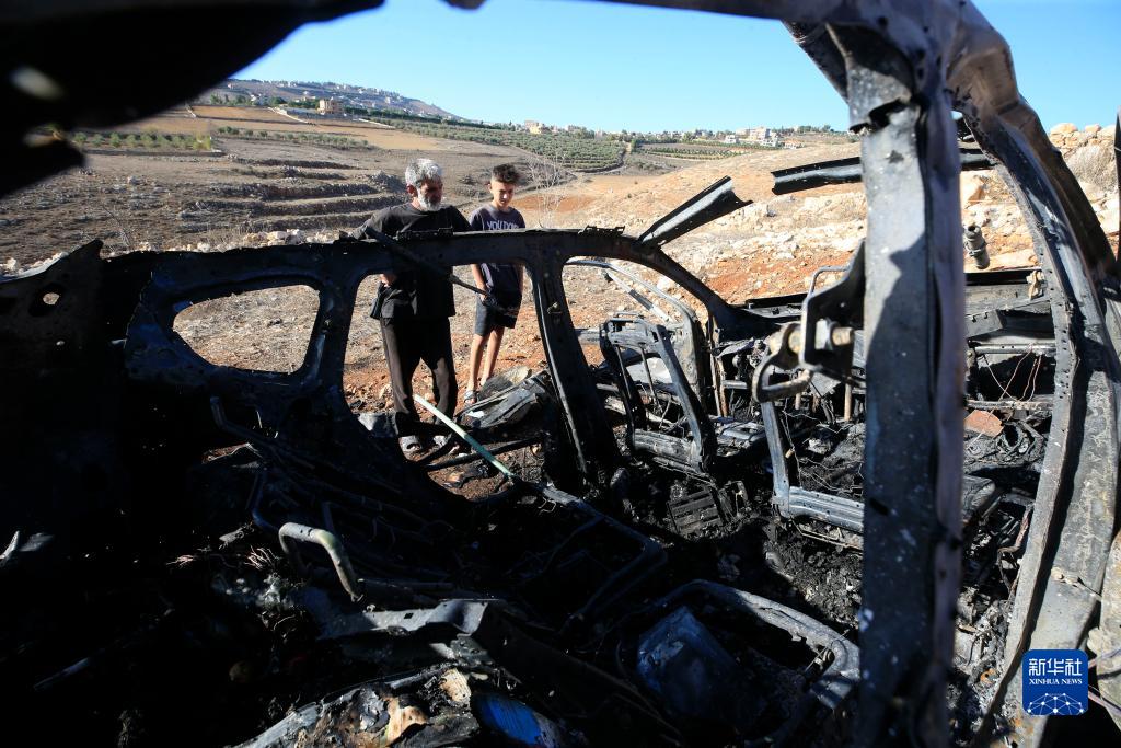 11月6日,在黎巴嫩南部艾納塔,人們站在被以色列無(wú)人機炸毀的車(chē)輛殘骸旁。