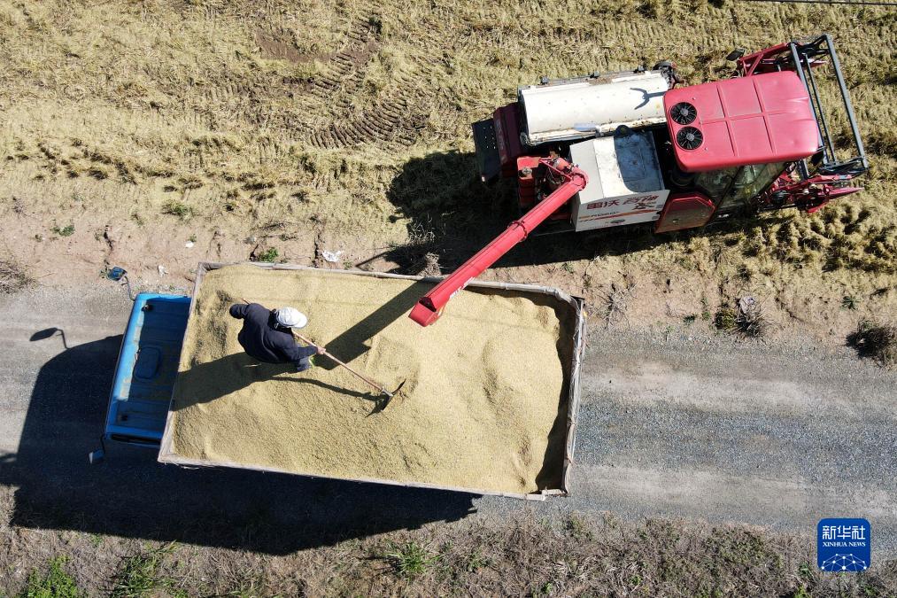 11月7日,在安徽省蕪湖市繁昌區荻港鎮,村民將收割的水稻裝車(chē)(無(wú)人機照片)。