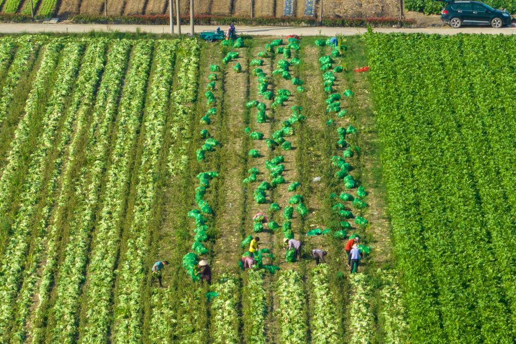 11月7日,浙江省余姚市黃家埠鎮農戶(hù)在田間收割蔬菜(無(wú)人機照片)。