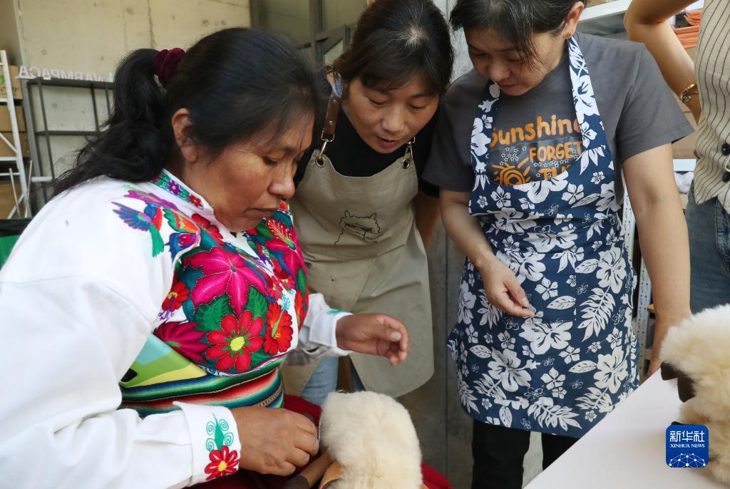 馬馬尼大叔的妻子格洛麗亞在“溫暖駝”品牌位于上海的倉庫內向本地員工演示羊駝玩偶修補的針?lè )ǎ?1月2日攝)。