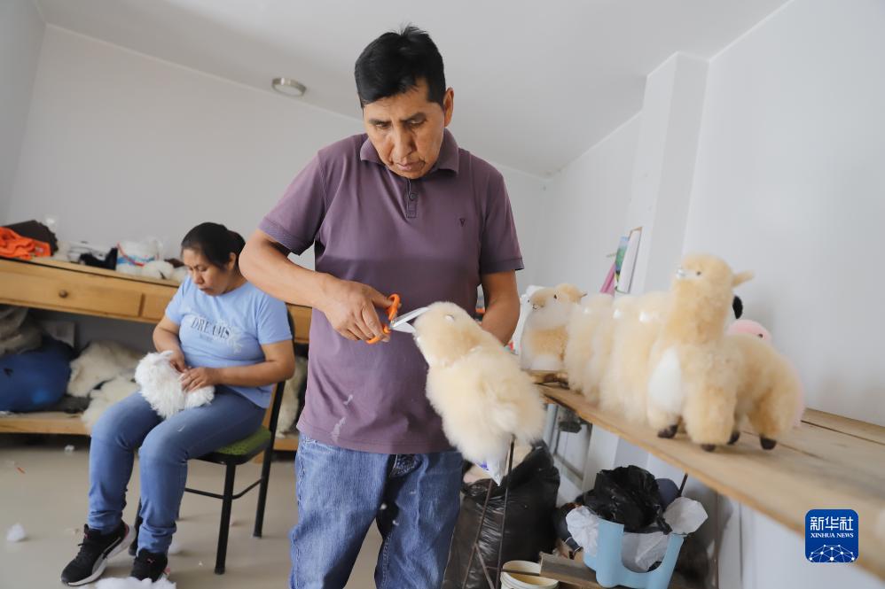 在秘魯南部城市阿雷基帕的工坊內,馬馬尼大叔(右)和妻子格洛麗亞打磨準備在上海進(jìn)博會(huì )上展示的羊駝玩偶(10月27日攝)。