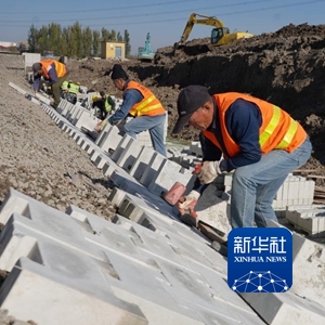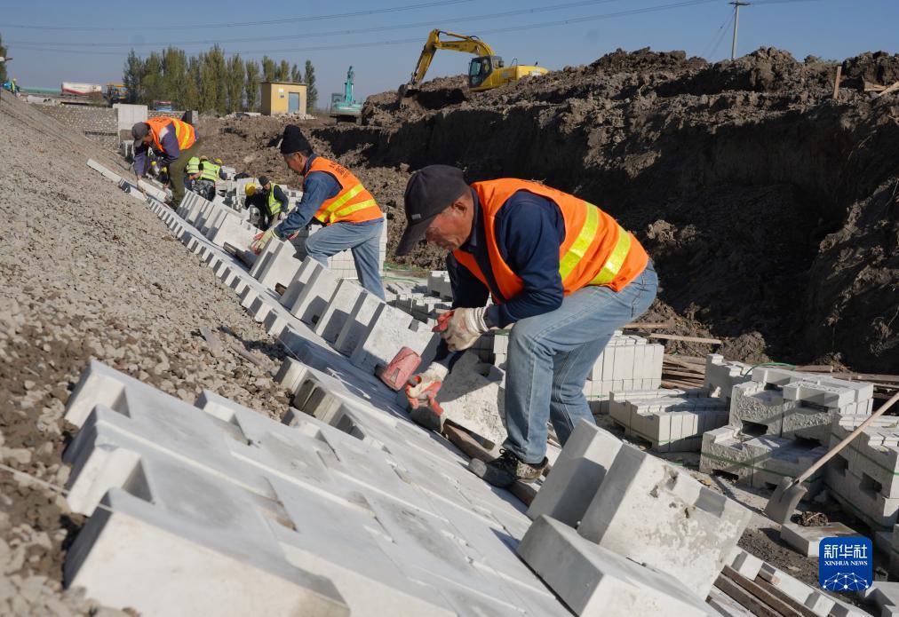 11月7日,工人在唐山市豐南區王蘭莊鎮彭家莊村灌溉水渠護坡加固工地施工。