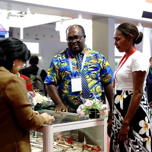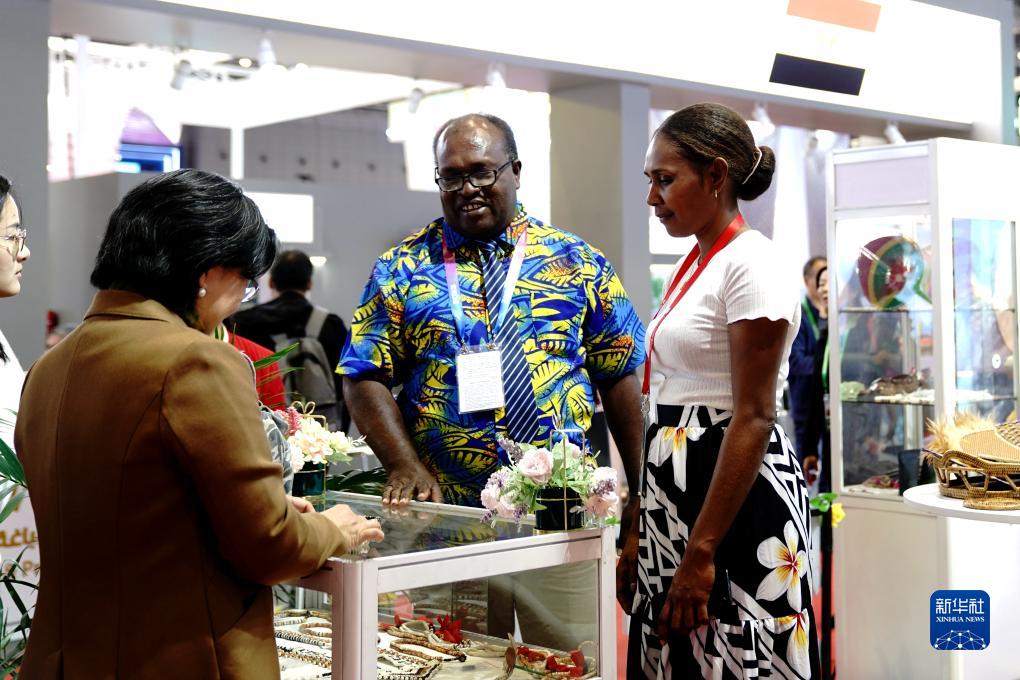 11月7日,在第六屆進(jìn)博會(huì )國家展區,所羅門(mén)群島參展商接待觀(guān)眾。