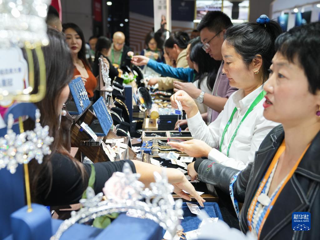 11月7日,在第六屆進(jìn)博會(huì )消費品展區,參觀(guān)者在挑選來(lái)自捷克的水晶制品。