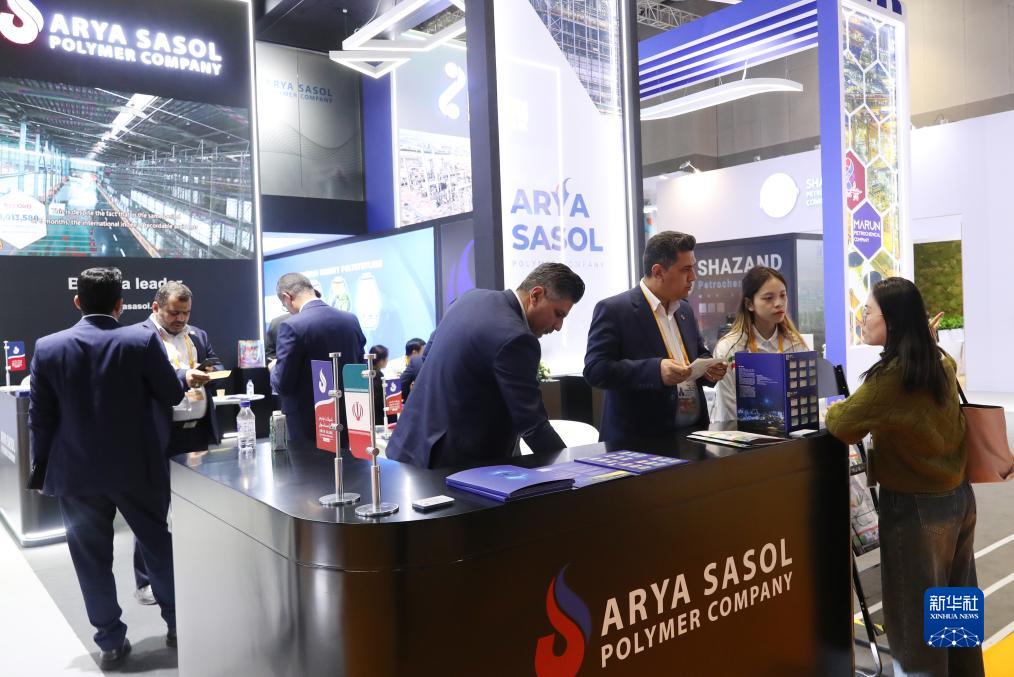 11月7日,參觀(guān)者在第六屆進(jìn)博會(huì )技術(shù)裝備展區的伊朗石油化學(xué)和工業(yè)公司展臺與展方工作人員交流。