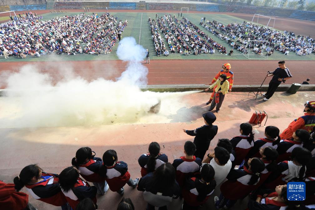 11月7日,在貴州省赤水市中等職業(yè)學(xué)校,消防救援隊員指導師生學(xué)習滅火器的使用方法。