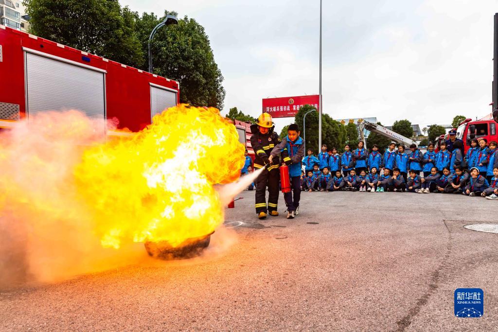 11月7日,貴州省安順市第七小學(xué)的學(xué)生在消防救援人員指導下學(xué)習使用滅火器滅火。