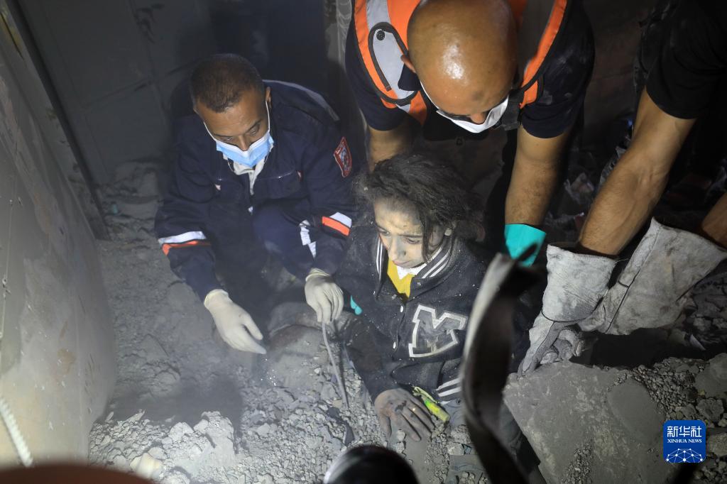 11月7日,在加沙地帶南部城市汗尤尼斯,人們在遭到以色列襲擊的建筑廢墟上實(shí)施救援。