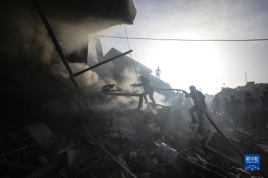 11月7日,在加沙地帶南部城市汗尤尼斯,人們在遭到以色列襲擊的建筑廢墟上實(shí)施救援。