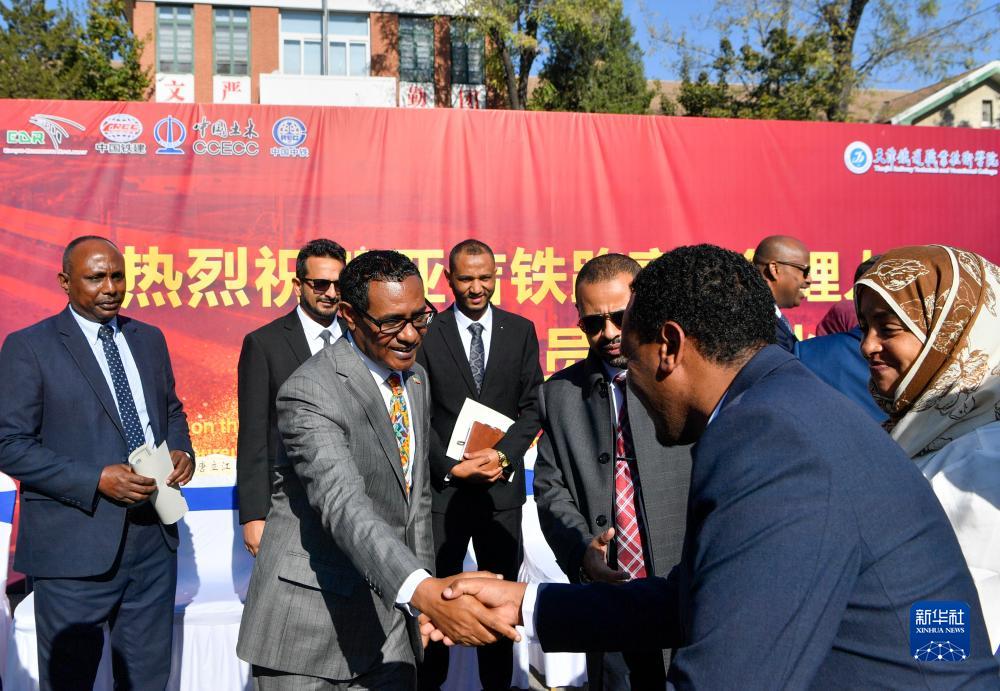 11月7日,在天津鐵道職業(yè)技術(shù)學(xué)院,埃塞俄比亞駐華大使塔費拉(前左)向結業(yè)學(xué)員表示祝賀。