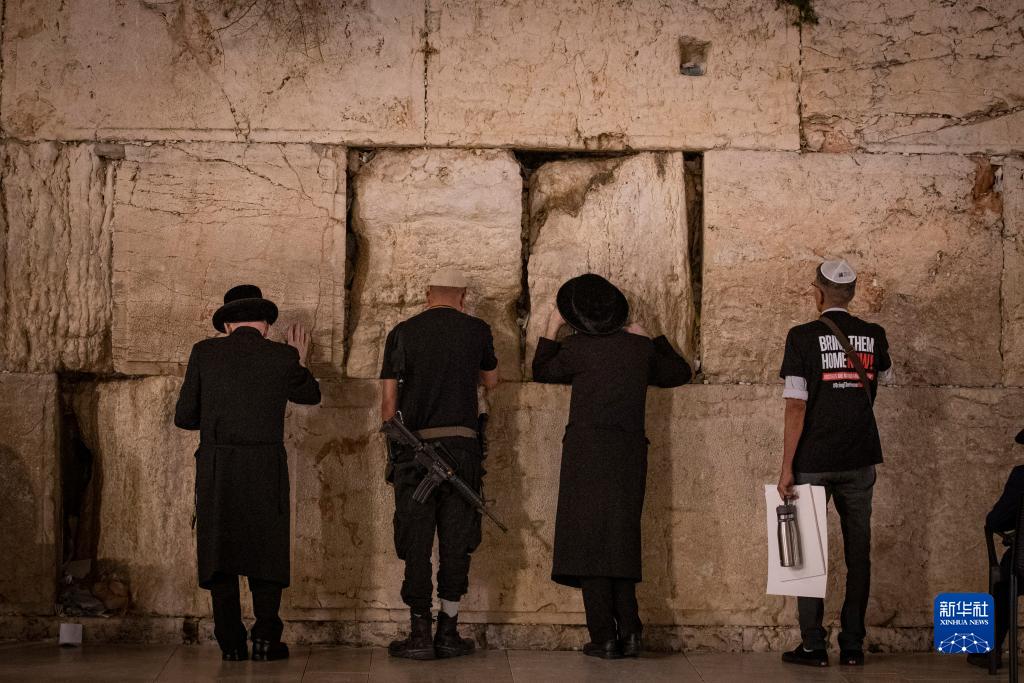 11月7日,在耶路撒冷老城“哭墻”前,人們向死者寄托哀思,并為被挾持的人員祈禱。