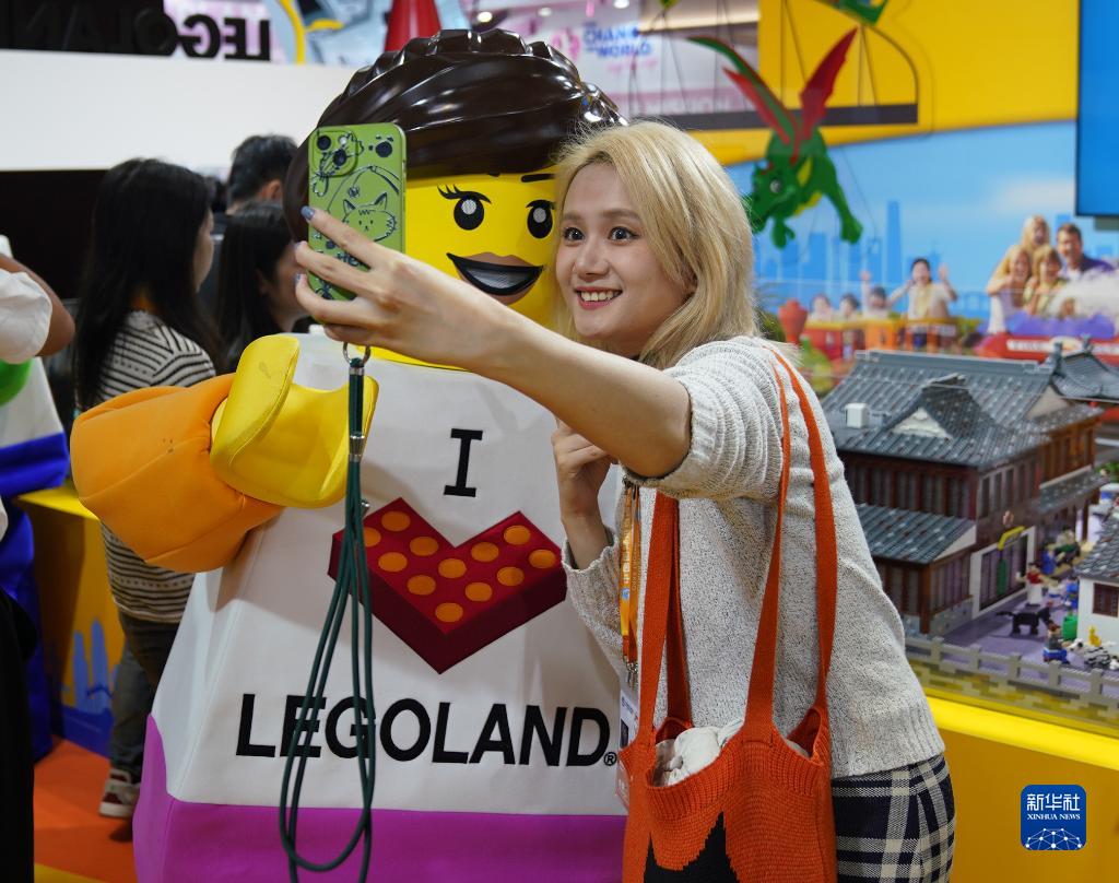 11月7日,在第六屆進(jìn)博會(huì )消費品展區樂(lè )高集團展臺,參觀(guān)者與樂(lè )高人偶合影。