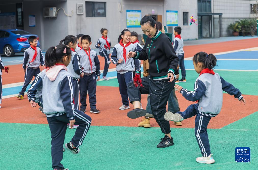 11月8日,湖州市月河小學(xué)教育集團吉山校區的學(xué)生們在老師的帶領(lǐng)下踢毽子。