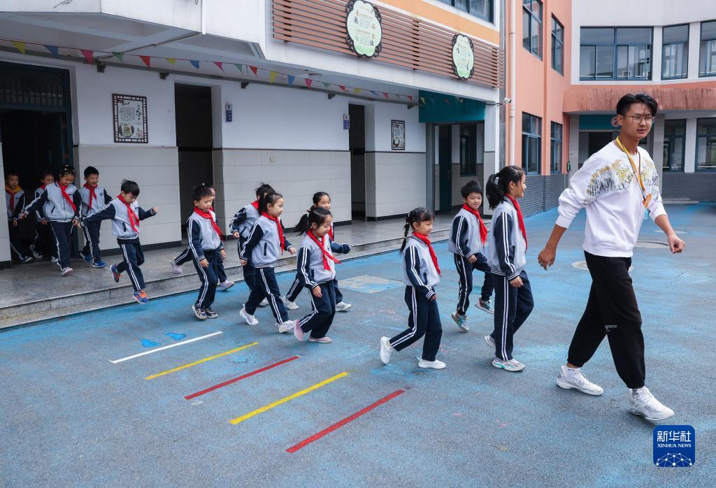 11月8日,湖州市月河小學(xué)教育集團吉山校區的值周老師在下課鈴響后帶領(lǐng)學(xué)生走出教室,參加課間趣味活動(dòng)。