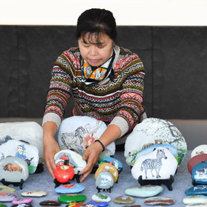 11月8日,在湖南省瀏陽(yáng)市小河鄉烏石村的烏石當代藝術(shù)館,農民在整理石頭畫(huà)。