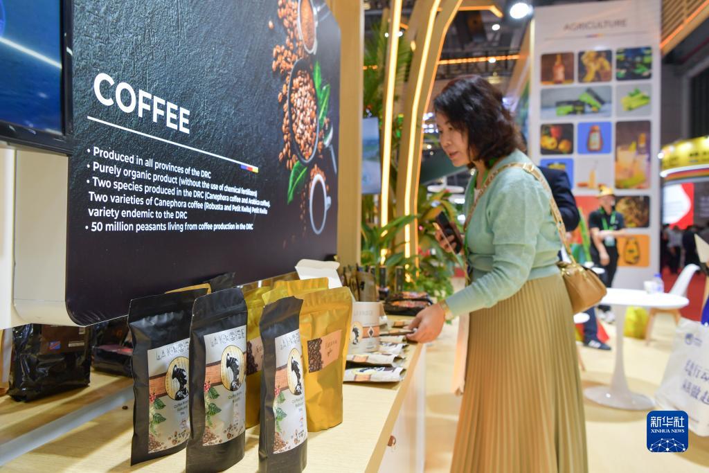 11月8日,在第六屆進(jìn)博會(huì )國家展剛果民主共和國館,觀(guān)眾在了解咖啡產(chǎn)品。