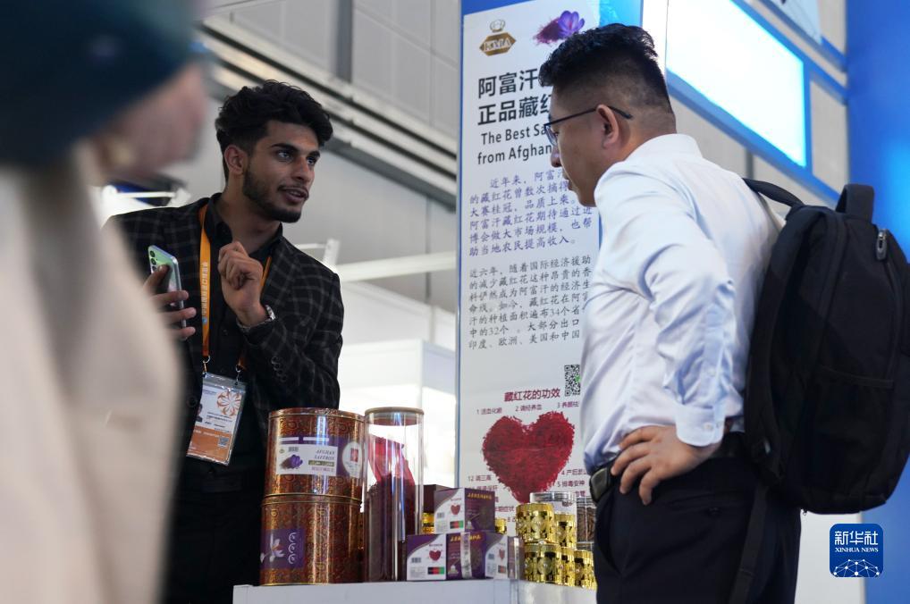 11月8日,在第六屆進(jìn)博會(huì )食品及農展品展區,參觀(guān)者在一家阿富汗展臺了解藏紅花。