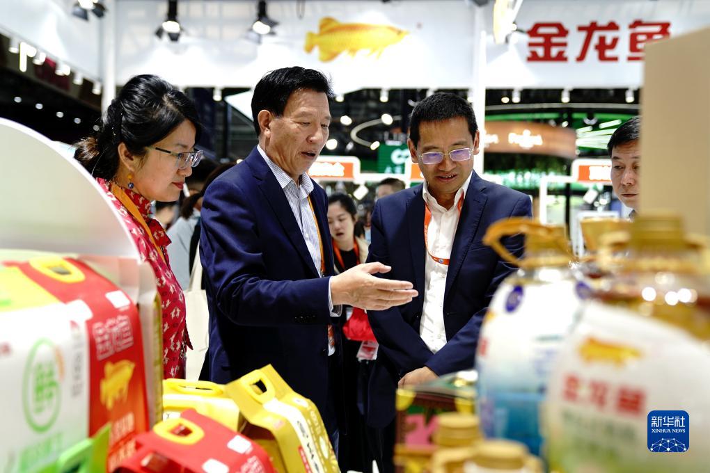 11月8日,在第六屆進(jìn)博會(huì )食品及農產(chǎn)品展區,益海嘉里金龍魚(yú)公司代表涂長(cháng)明(左二)向觀(guān)眾介紹展品。