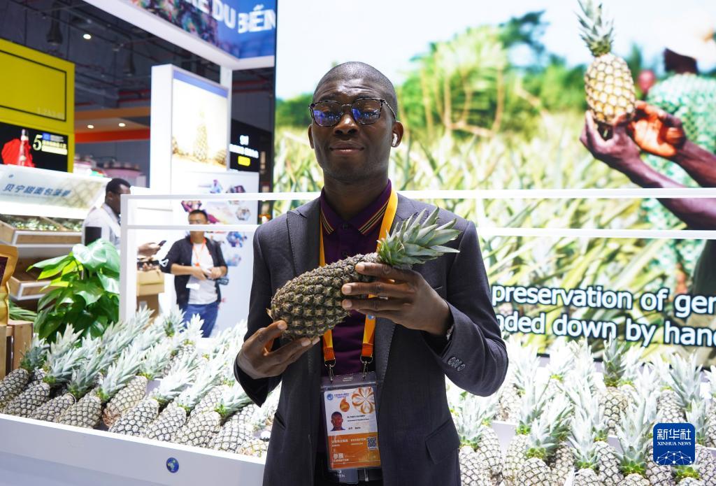 11月8日,在第六屆進(jìn)博會(huì )食品及農產(chǎn)品展區,工作人員展示貝寧菠蘿。這是貝寧菠蘿第一次參加進(jìn)博會(huì )。
