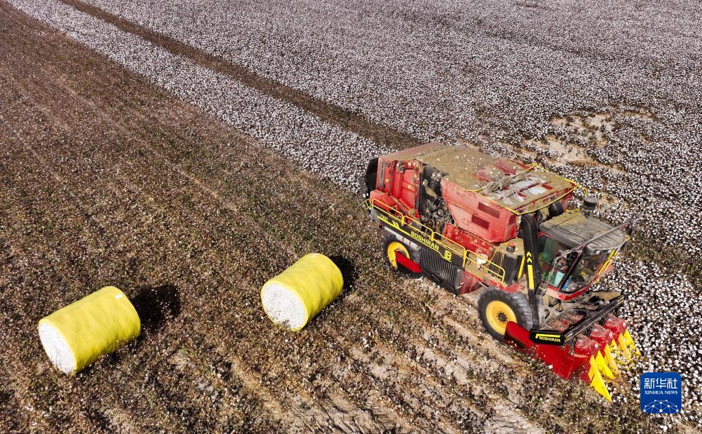 在新疆尉犁縣巴西買(mǎi)里村,農機手駕駛采棉機在爾肯家的棉田中作業(yè)(10月24日攝,無(wú)人機照片)。