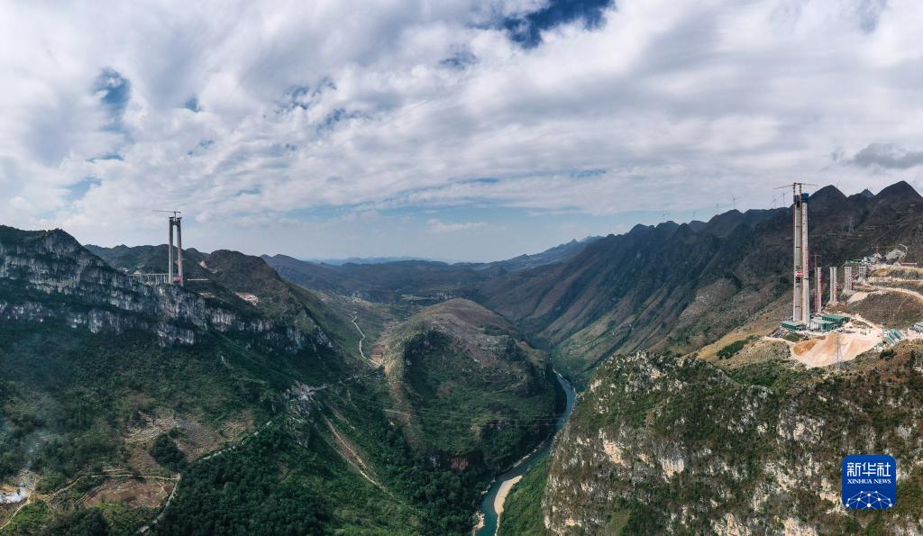 這是11月8日拍攝的貴州六安高速花江峽谷大橋建設現場(chǎng)(無(wú)人機全景照片)。