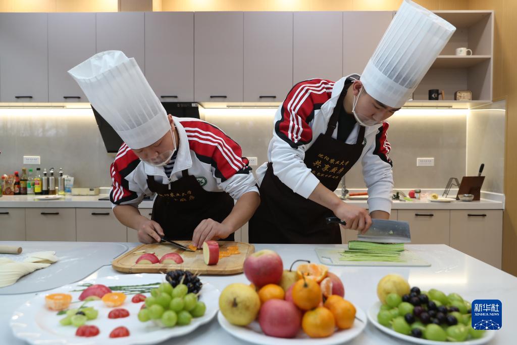 11月9日,在沈陽(yáng)農業(yè)大學(xué)一食堂,學(xué)生在共享廚房練習切水果蔬菜。
