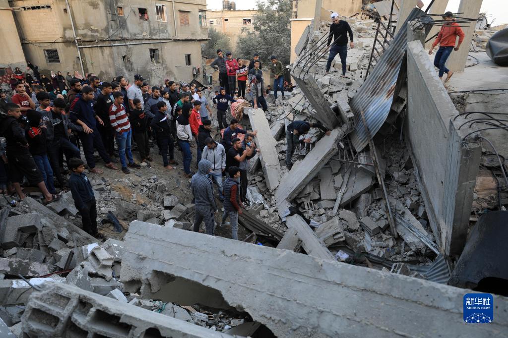 11月9日,在加沙地帶南部城市汗尤尼斯,人們在遭以色列襲擊后的建筑廢墟中實(shí)施救援。