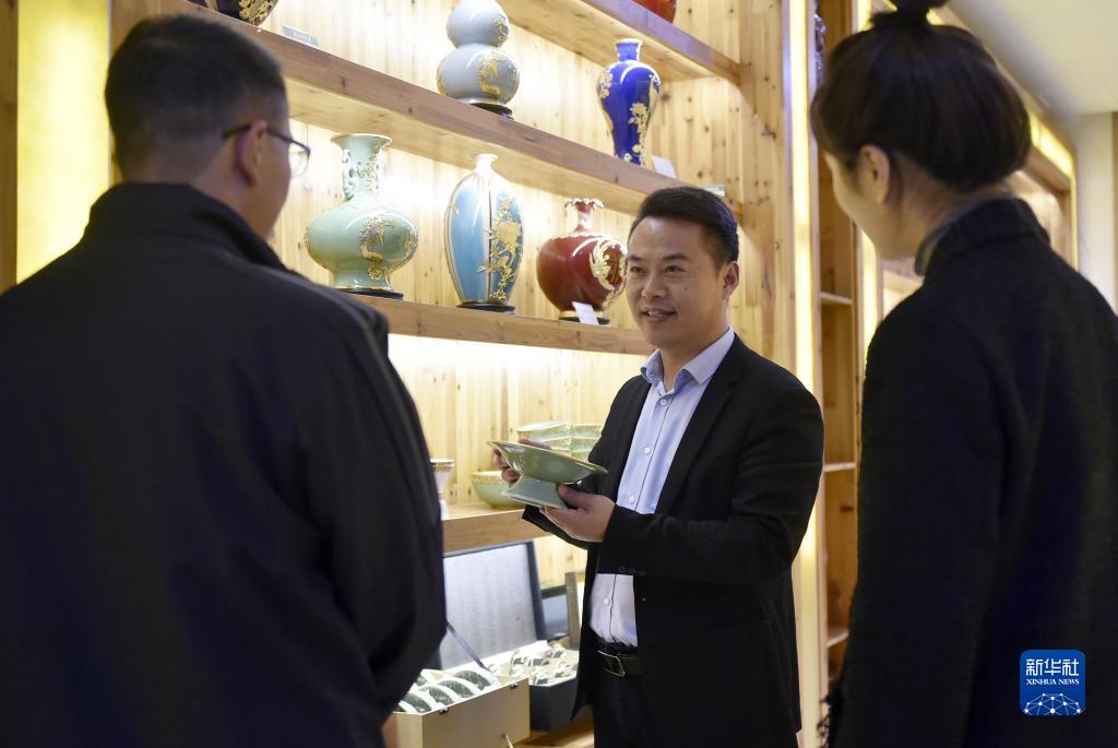 11月9日,李冰(中)在自己的工作室里向來(lái)訪(fǎng)者介紹金鑲玉作品。