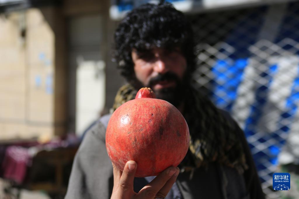 11月10日,在阿富汗首都喀布爾,商販展示產(chǎn)自阿富汗南部坎大哈省的石榴。