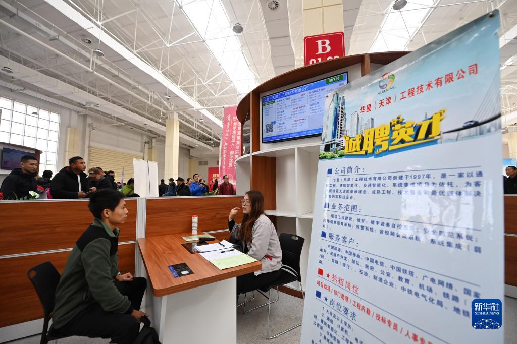 11月10日,求職者在招聘會(huì )現場(chǎng)與用人單位交流。