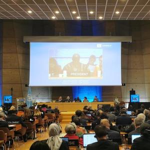這是11月9日在法國巴黎拍攝的聯(lián)合國教育科學(xué)文化組織第42屆大會(huì )現場(chǎng)。