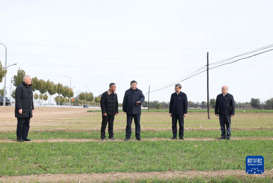 11月10日,中共中央總書(shū)記、國家主席、中央軍委主席習近平在北京、河北考察災后恢復重建工作。這是10日下午,習近平在河北保定涿州市刁窩鎮萬(wàn)全莊村村邊農田察看冬小麥長(cháng)勢。