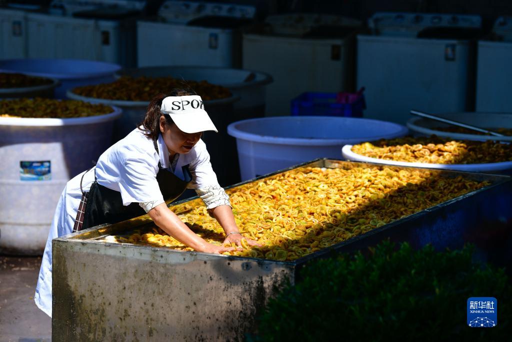 農民在貴州省龍里縣谷腳鎮高堡村清洗刺梨切片(9月1日攝)。
