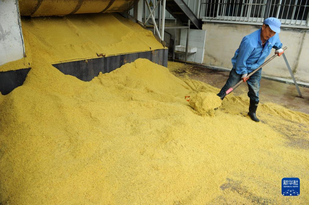 貴州省龍里縣高新技術(shù)產(chǎn)業(yè)園區一家刺梨加工企業(yè)的工人對刺梨渣進(jìn)行回收再利用(2018年8月23日攝)。