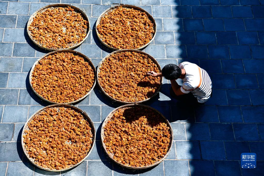 農民在貴州省龍里縣谷腳鎮茶香村一家刺梨專(zhuān)業(yè)合作社晾曬刺梨果脯(9月1日攝)。