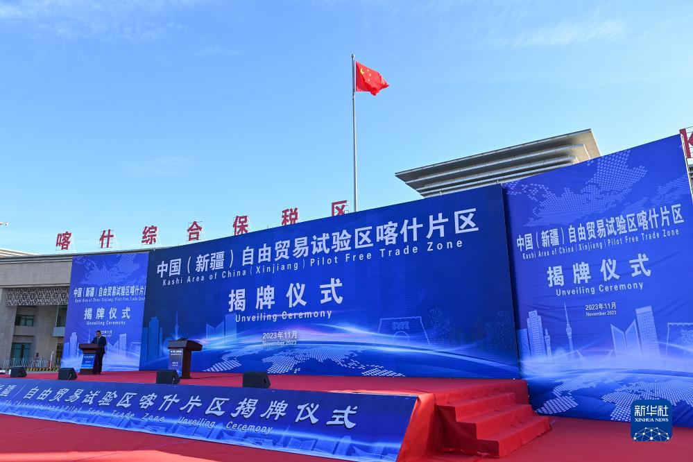 11月11日拍攝的中國(新疆)自由貿易試驗區喀什片區揭牌儀式現場(chǎng)。