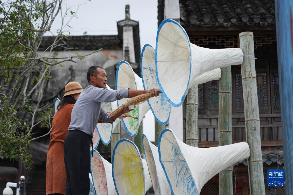 11月11日,人們在葉氏支祠外的廣場(chǎng)上繪制喇叭狀的紙工藝品,作為展覽開(kāi)幕式的布景。