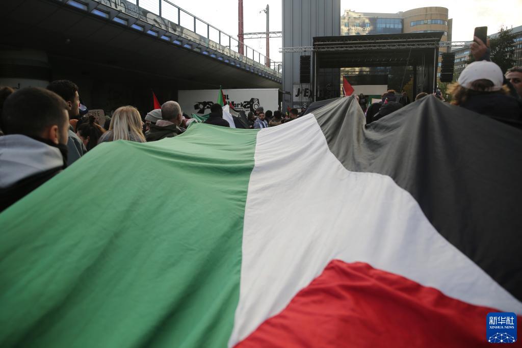 當日,眾多巴勒斯坦支持者在比利時(shí)布魯塞爾集會(huì ),呼吁盡快實(shí)現加沙?;?。
