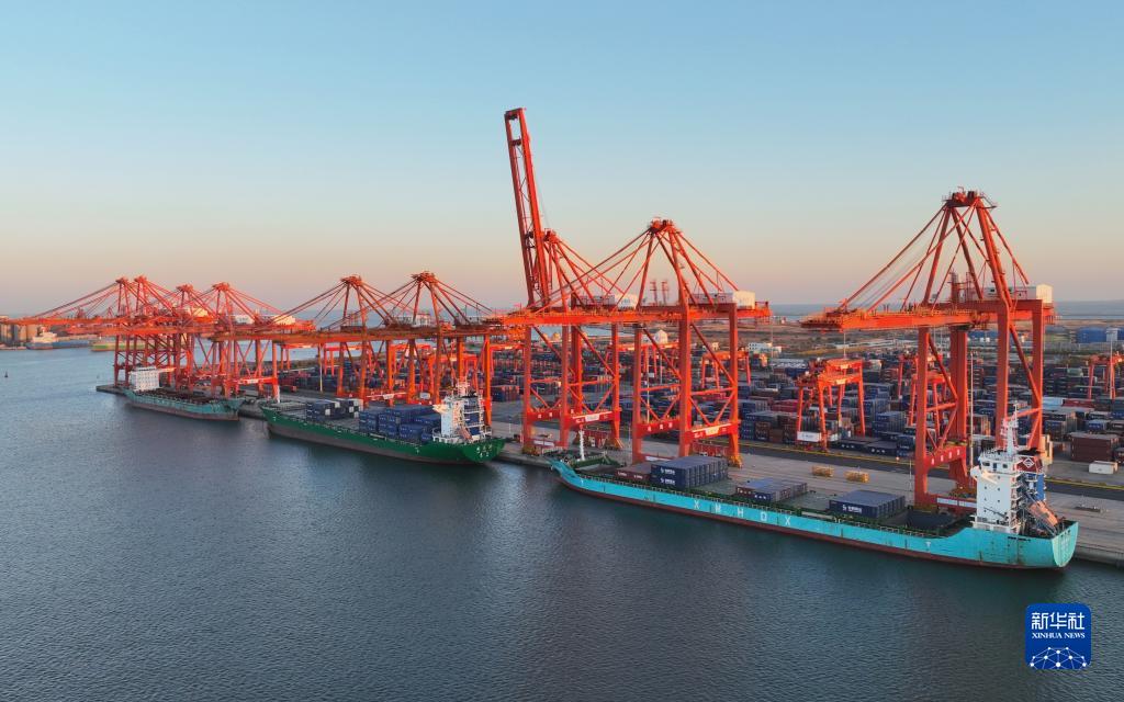 11月11日,三艘輪船靠泊在唐山港京唐港區集裝箱碼頭裝卸貨(無(wú)人機照片)。