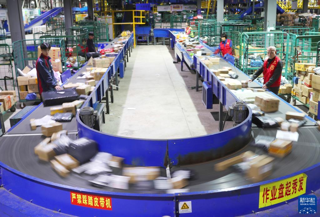 11月12日,工作人員在中國郵政集團有限公司衡陽(yáng)郵區中心局郵件處理中心分揀快遞包裹。