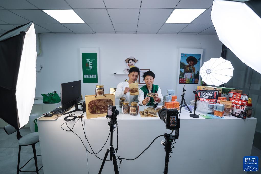 11月12日,浙江省諸暨市東白湖鎮上英村黨總支書(shū)記趙堅均、黨員志愿者莊園(右)在“上英園夢(mèng)”共富工坊直播間銷(xiāo)售香榧。