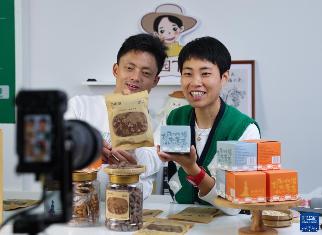 11月12日,浙江省諸暨市東白湖鎮上英村黨總支書(shū)記趙堅均、黨員志愿者莊園(右)在“上英園夢(mèng)”共富工坊直播間銷(xiāo)售香榧。